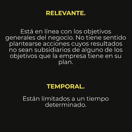 - Relevant (relevantes): los objetivos deben estar relacionados con las metas globales de la empresa y mostrar una correlación clara. Por ejemplo, si queremos conseguir un impacto en las ventas, la métrica a seguir debería ser el número de conversiones y no las interacciones en Facebook.